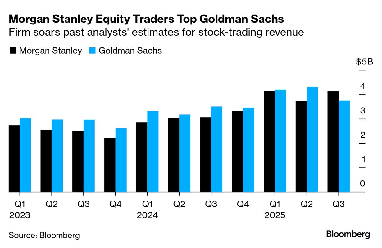 Morgan Stanley stock trading performance soared past expectations in the third quarter, topping all of the bank’s largest rivals with revenue from the business surging 35% to $4.12 billion in the third quarter. That surpassed analyst estimates of a 6.6% increase and even beat Goldman Sachs’ $3.74 billion. Goldman in recent years dominated equity-trading, but under Chief Executive Officer Ted Pick, Morgan Stanley has been eager to regain the top spot. | |