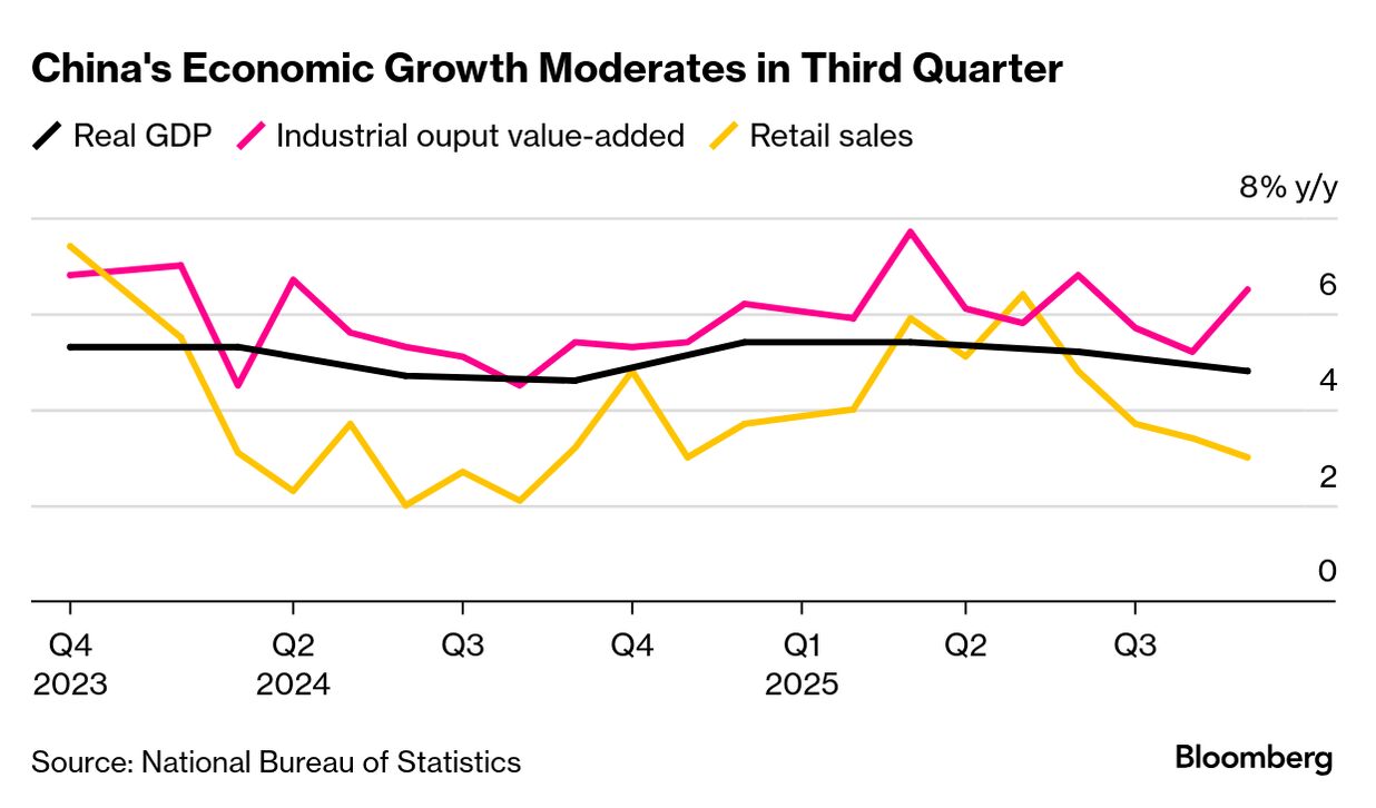 China’s economy is still on track to reach this year’s expansion goal, according to the government, even after the weakest growth in a year. GDP grew 4.8% from a year earlier in the three months through September. Still, growth over the first three quarters laid a “solid foundation” for achieving the full-year growth goal of around 5%, the National Bureau of Statistics said. | |