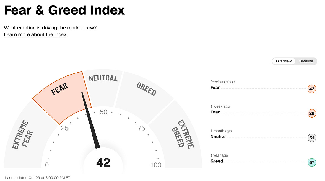 By monthly tradition, you’ll get an update on our Best Buys of the month. What’s going on in the markets? And what are our favorite stocks? Let’s become a little bit wiser today. November 2025The S&P 500 increased by +2.8% in October. Investors are fearful today according to the Fear & Greed Index: