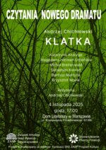 Stowarzyszenie Pisarzy Polskich i Związek Artystów Scen Polskich zapraszają jutro, czyli we wtorek 4 listopada o godz. 17 do Domu Literatury przy Krakowskim Przedmieściu 87/89 w Warszawie na czytanie nowego dramatu Andrzeja Chichłowskiego zatytułowanego „Klatka”. Wystąpią: Katarzyna Anzorge, Magdalena Herman Urbańska, Michał Breitenwald, Sebastian Konrad, Bartosz Martyna i Krzysztof Nowik. Reżyseria: Andrzej Chichłowski. Projekt dofinansowany […]   |