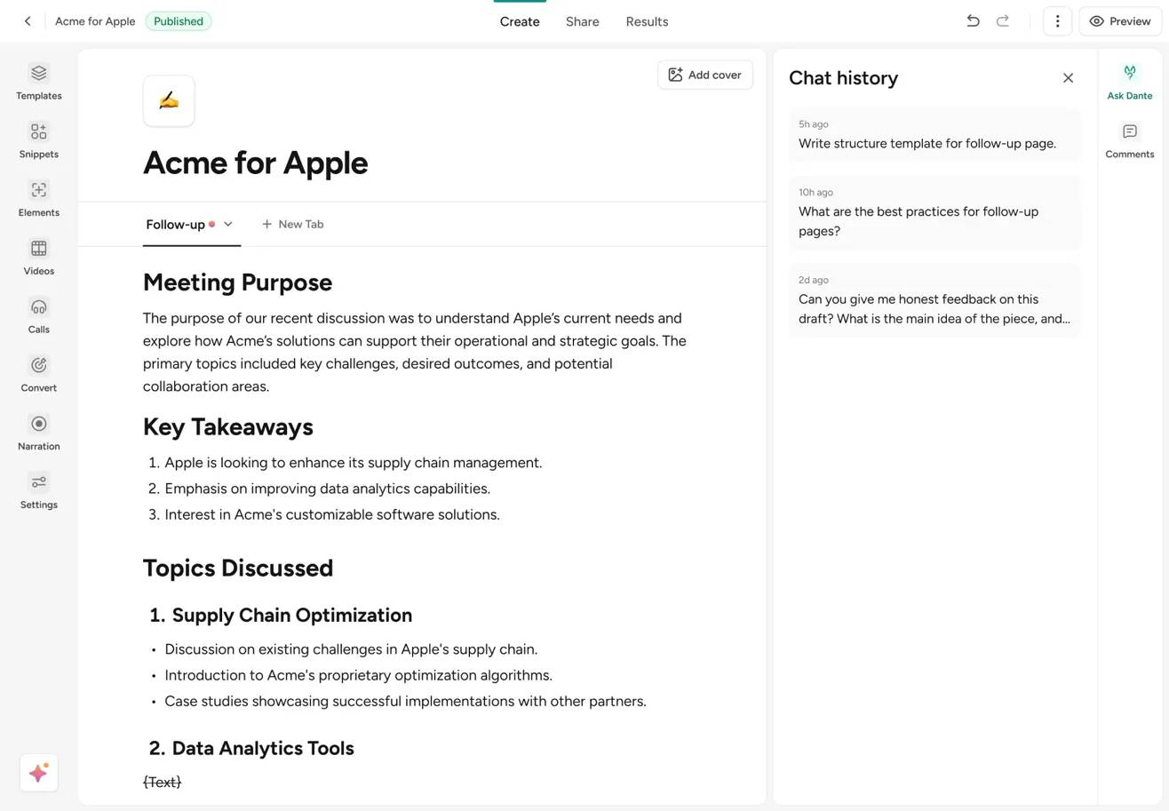 No more "wait, what did we discuss?" moments. Every conversation, question, and decision about your follow-up page is right there in the sidebar. Your manager asks about deal strategy? It's documented. Prospect had a question? You see exactly what was answered.
