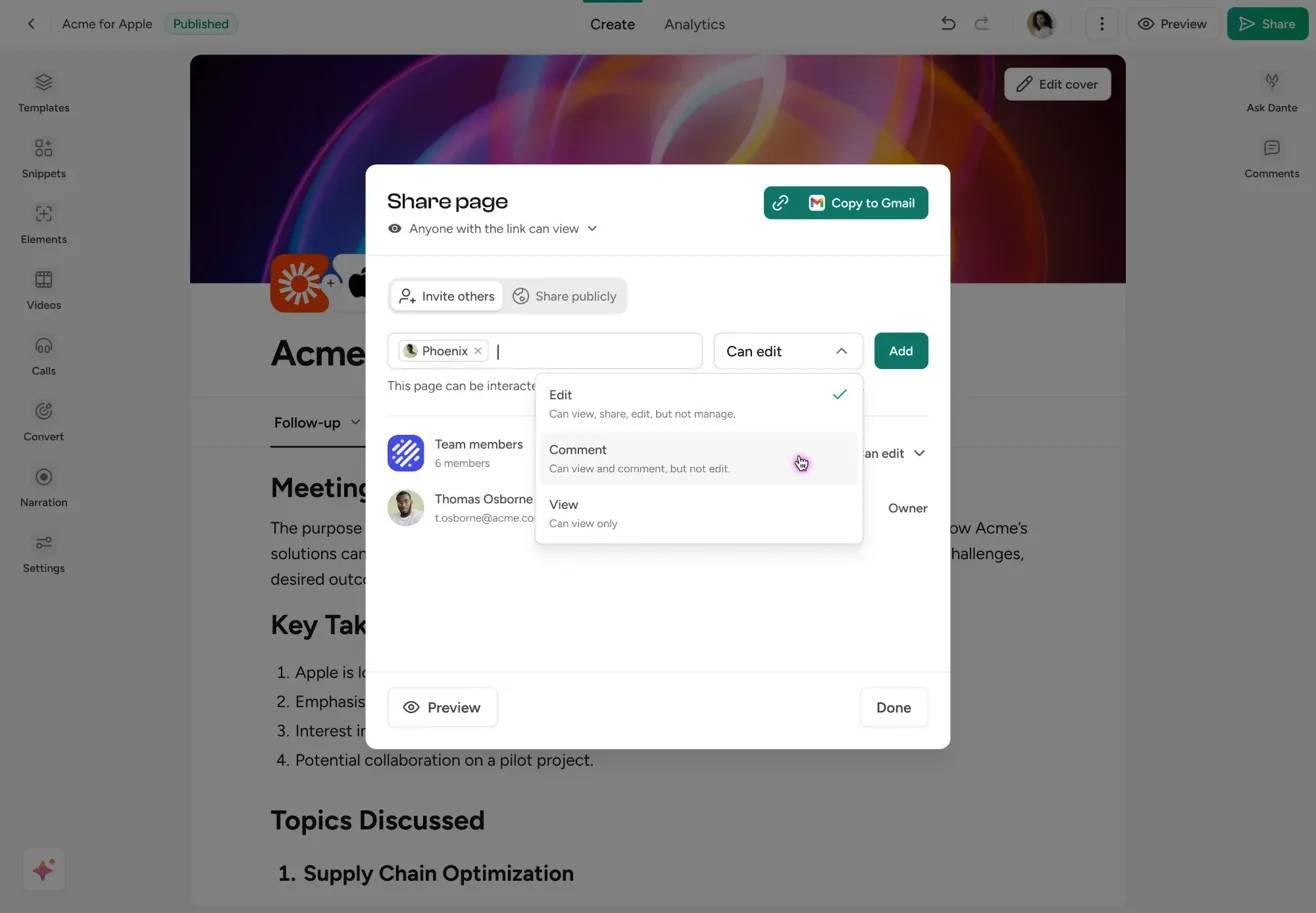 Add your sales engineer. Loop in your manager. Bring in the solution consultant. Everyone can comment, edit, and collaborate on the same follow-up page in real-time. Set permissions so your champion sees only what they need, while your team sees everything.