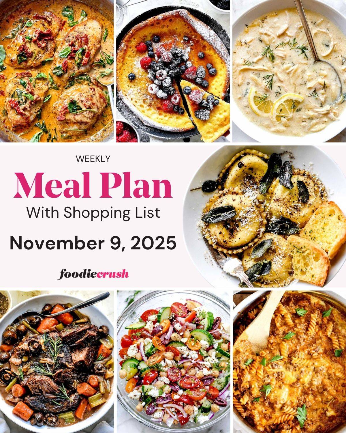 This week's meal plan includes: marry me chicken, browned butter ravioli with crispy sage, homemade hamburger helper, Greek lemon chicken soup, and my mom's super easy pot roast, with mix and match sides, and a Dutch baby pancake for a weekend breakfast or brunch.