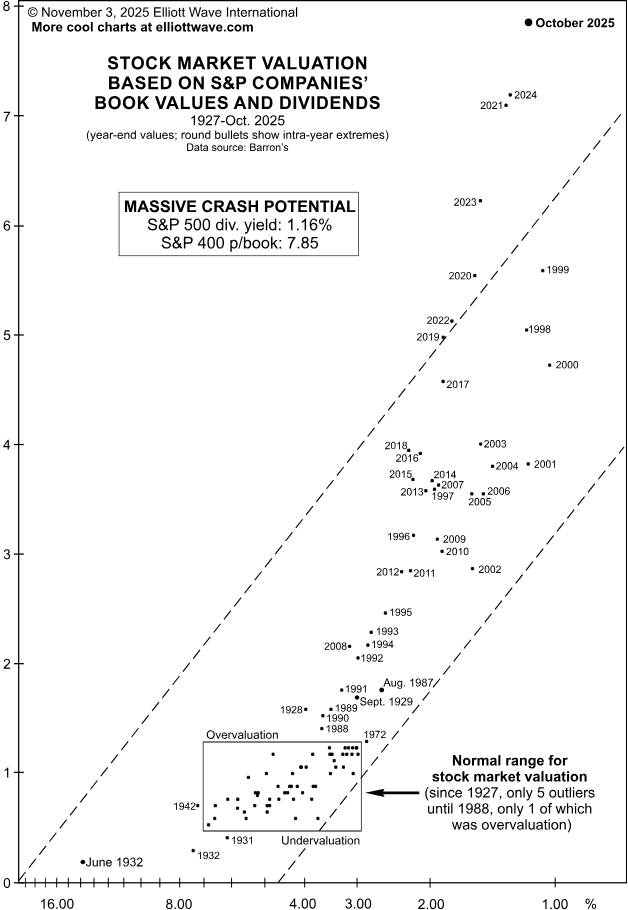 Hi Elliott Waver, When the S&P topped back in March 2000, we remarked that stock valuations had drifted all the way out to Pluto. Now, at the end of October 2025, valuations have blown well past those prior extremes. Read Bob Prechter’s commentary from the just-released November Elliott Wave Theorist: |