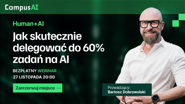 Już 27.11.2025 (czwartek) o 20:00 odbędzie się szkolenie online „Human + AI, czyli jak wykorzystać Sztuczną Inteligencję, żeby zarabiać więcej, pracować mądrzej, rozwijać się szybciej” - oparte na praktycznych przykładach z firm, które wdrażają AI na co dzień.