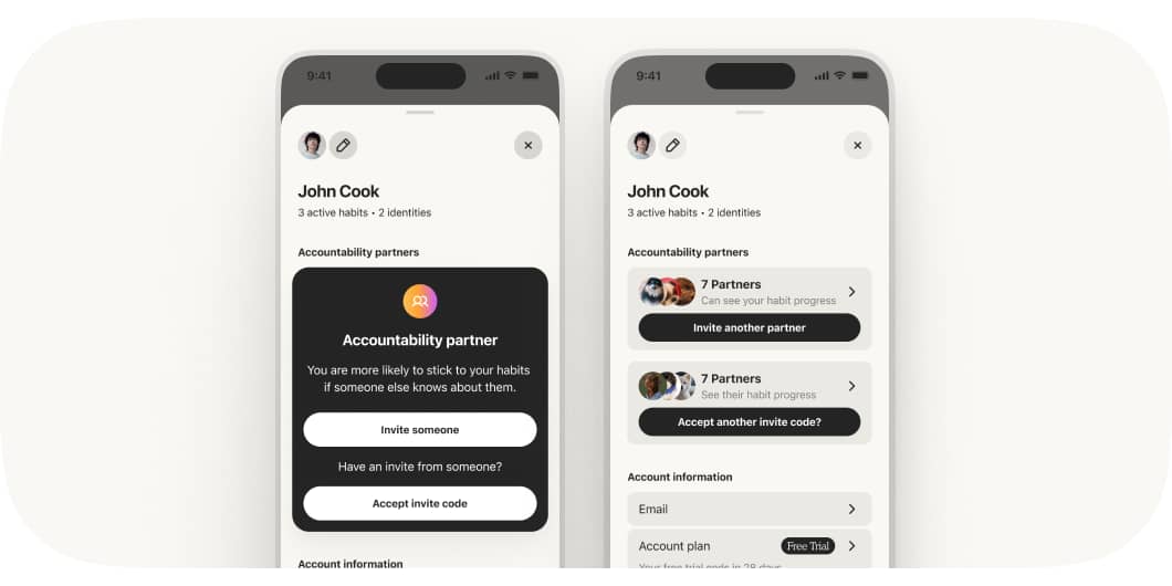 - Use Atoms with an Accountability Partner, a unique feature that lets you invite someone to view your progress or be invited by someone to view their progress. Navigate to your profile in Atoms to get started.