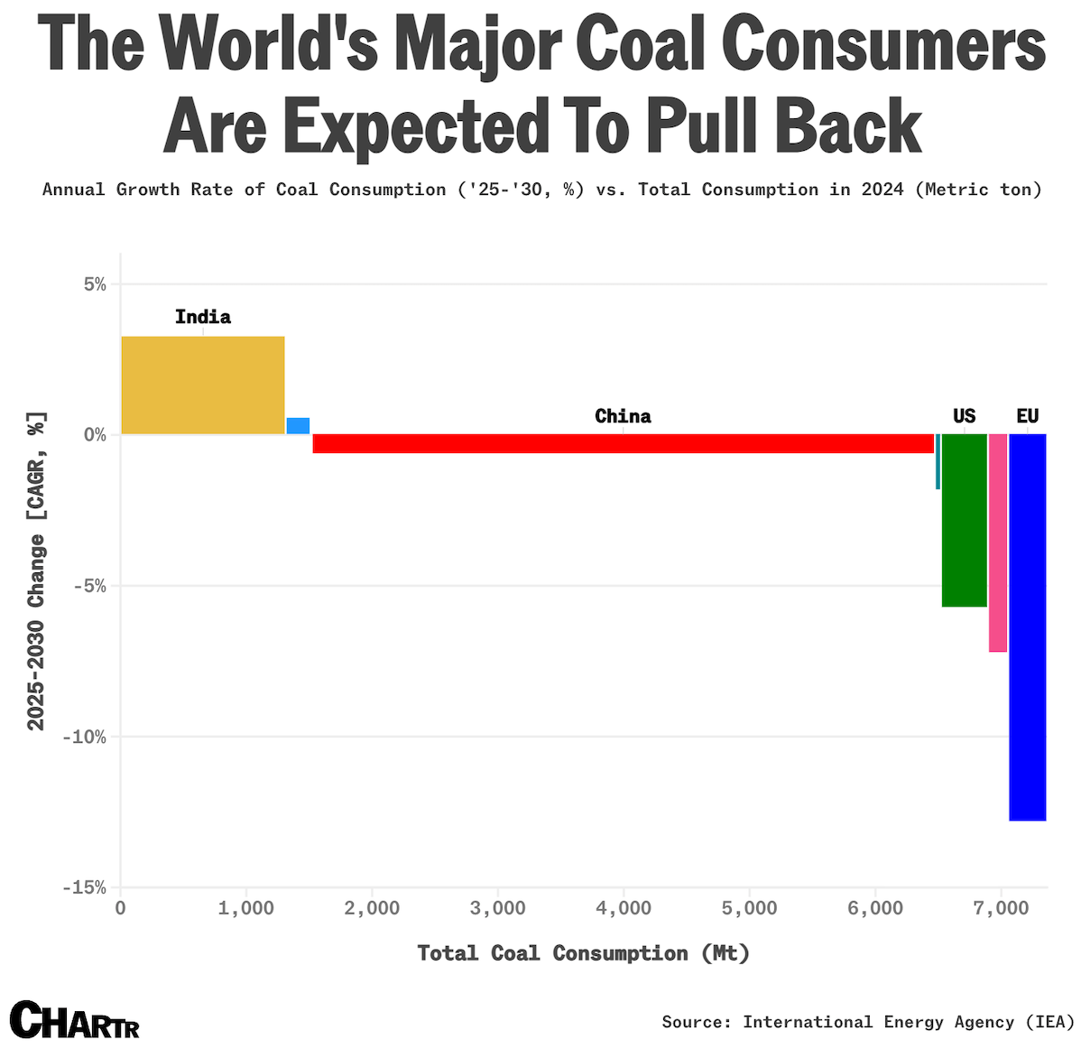 Those declines are expected to offset strong growth elsewhere, most notably India. The country is set to post the largest absolute increase in coal demand, adding over 200 million tonnes by 2030 as electricity demand surges.