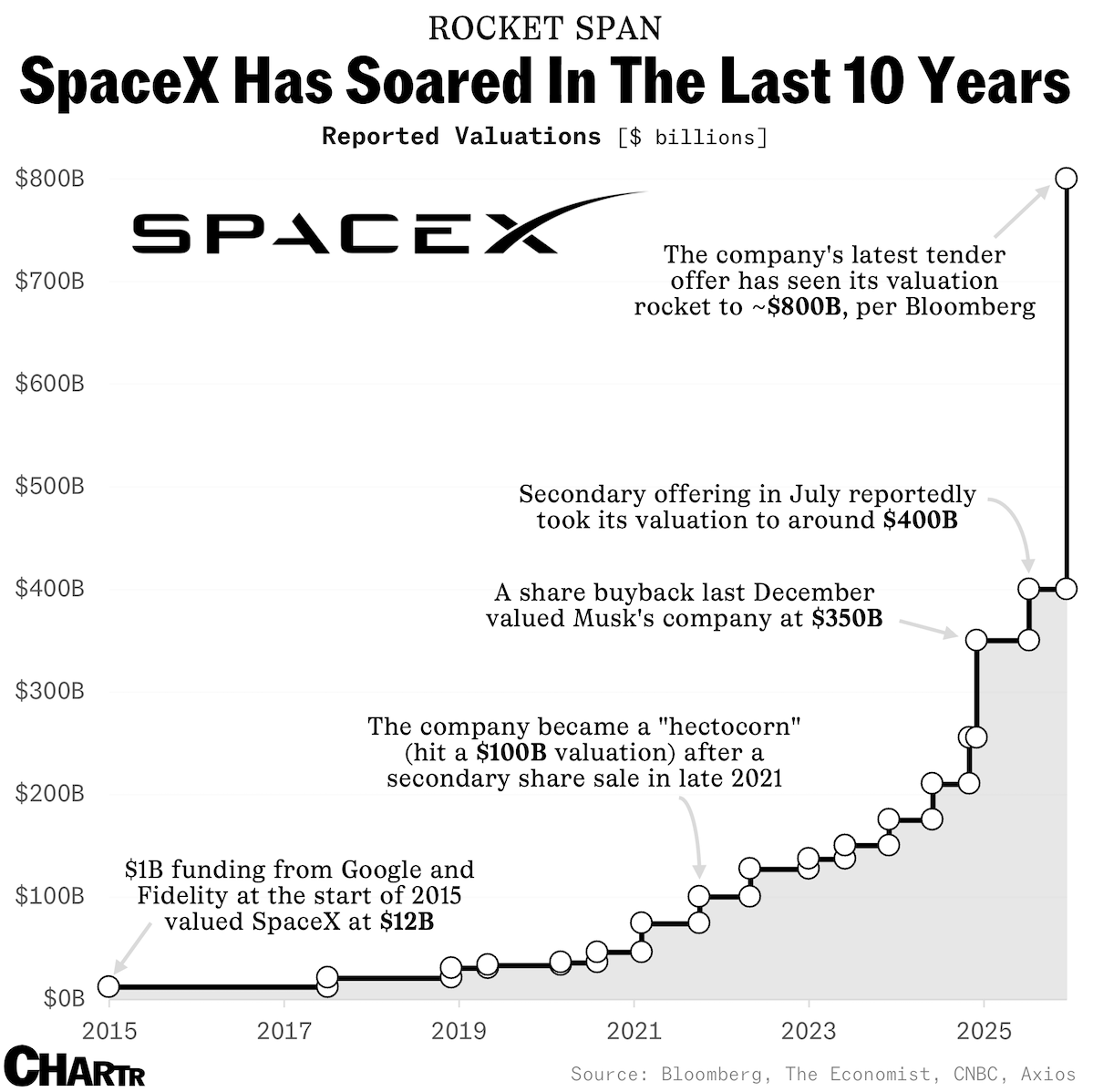 - To the moon: SpaceX is now valued at ~$800 billion ahead of its slated 2026 IPO.