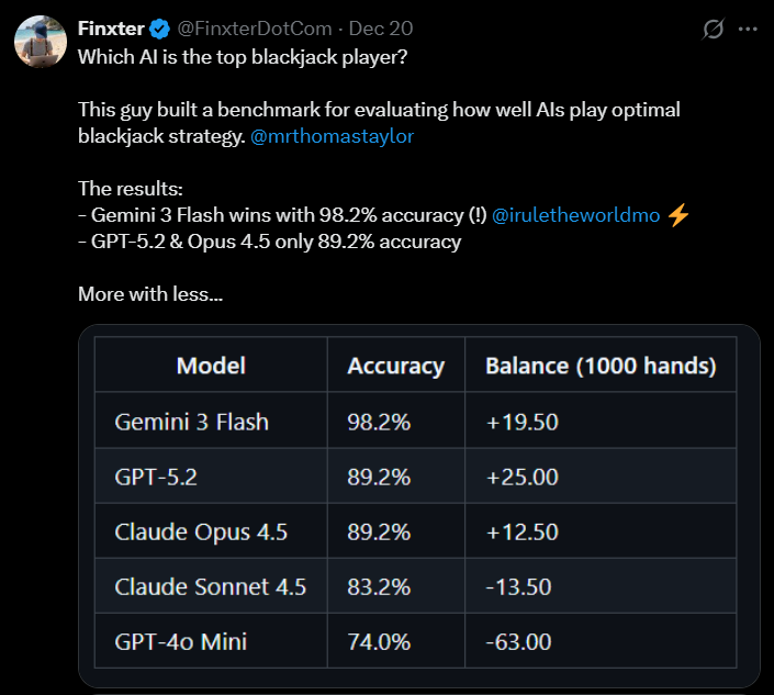 Additionally, Google's new Flash model was released last week (you can already use it in Gemini). It offers the best cost-to-performance ratio in the industry, even outperforming major models in Blackjack and other practical benchmarks as we have learned last week: