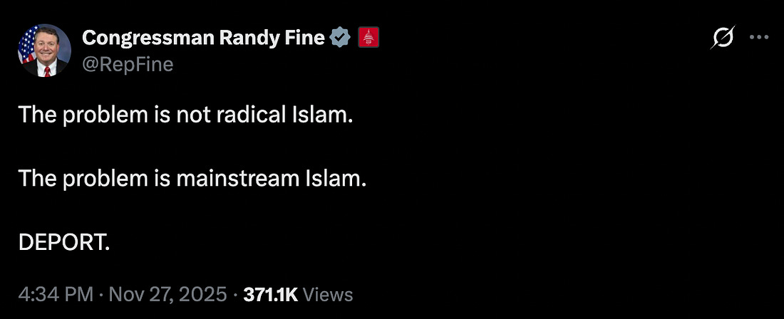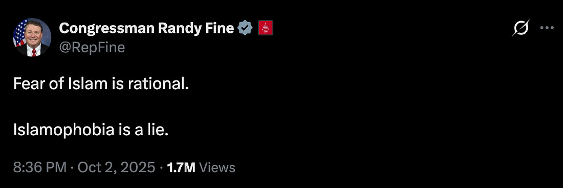 Good afternoon, Press Pass readers. It’s a short week because of the Christmas holiday, but Press Pass will be back when Congress returns to session in January. It’s going to be a wild year on the Hill. If you want to stay up to date with it all, hop on a free 30-day trial for a Bulwark+ membership. That will get you through the next month at no cost. If you stick around after that, your yearlong subscription will carry you through next fall’s midterms and beyond. What a deal! Sign up at the link below. Today’s edition is about how and why some GOP lawmakers have latched on to bigotry to advance their personal and political goals—and no longer feel the need to dog-whistle it. Republicans have traditionally distinguished between radical and mainstream Islam, emphasizing that the overwhelming majority of Muslims around the world want peace and stability for themselves and their families, like anybody else. But lately, some GOPers have taken a sharp turn by explicitly discriminating against regular, law-abiding Muslim Americans. The racism is snowballing on Capitol Hill; I spoke with a Muslim Republican to get a bit of perspective on it all. In addition, if you want to understand the next phases of the Epstein Files saga, I’ve got you covered. It’s starting to look like it could take up even more of Congress’s already limited work schedule in the new year. Lastly, I read a lot of Substacks and, as the year comes to an end, I wanted to share with you all my favorite ones—besides The Bulwark, obviously. A Green Light for Anti-Islam Bigotry for Trump’s GOPCongressional Republicans are openly attacking Muslim Americans.Almost a decade removed from President Donald Trump’s attempt to ban Muslims from entering the country during his first term—a vile passion project that has been given new life in his second presidency—a growing number of House and Senate Republicans are taking Islamophobia to a new level, actively calling for discrimination against Muslims and even arguing that some should be denaturalized and deported from the United States. Foremost among the proudly anti-Muslim politicians is Rep. Randy Fine (R-Fla.). “I think mainstream Islam is not compatible,” Fine said in a November Newsmax interview when asked by host Todd Starnes if Muslims can coexist with the Constitution. “I think mainstream Islam is a threat to the United States.” “The left is rooted in a belief that all cultures are equal, that we’re all good people, that we can sit and talk through our problems, that we all share the same values. And that is not true,” Fine said last week in another Newsmax appearance. “There is evil in this world. Mainstream Islam, as we saw on October 7th, as we’ve seen in Syria, as we’ve seen in Nigeria—it lionizes and it glorifies death. That’s what they celebrate.” Fine has also posted his views on X: In another post attacking a speech by his House colleague, Rep. Rashida Tlaib (D-Mich.), who is a practicing Muslim, Fine wrote: “This is the ugly face of Islam in America. Believe them when they say they are just getting started. ItR |