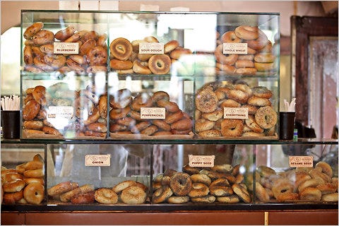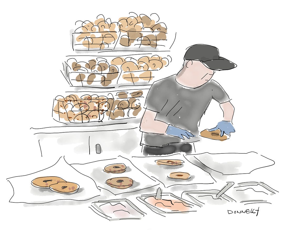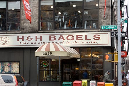 My first apartment in New York was on West 79th Street. There was a great bagel place on the corner of Broadway and 80th, which I routinely visited on Sunday mornings. Incredible bagels. New Yorkers know what I’m talking about: H&H Bagels. They closed in 2011 because of tax evasion issues and other shady stuff. I’m sorry I never took photos of the inside of that 79th street store. It was really bare bones, nothing but bagels, tubs of cream cheese and a cooler for soda and juice. No tables. Sometimes the line was really long, going outside the door, they are so good. I always felt intimidated when I went in, thinking I had to order very fast. This was the way they displayed the bagels— I think this photo below that I found on the internet was taken in that 79th store. Apparently, the maker of the iconic bagels never really fully went out of business, and now there’s one in the new train station, Moynahan Hall. The drawing above was done from a photo I took this morning there! It’s been a holiday tradtion in my family ever since I lived in that neighborhood decades ago to have lox and bagels on Christmas morning. I always try to get H&H Bagels because, well, they are the best. I got a dozen everything. To celebrate the holidays and the almost-end of a very difficult year, here is a link for Seeing Things Holiday Special subscription discount! I hope your Tuesday is a good one! See you tomorrow, thanks for being here. You're currently a free subscriber to Seeing Things. For the full experience, upgrade your subscription. |