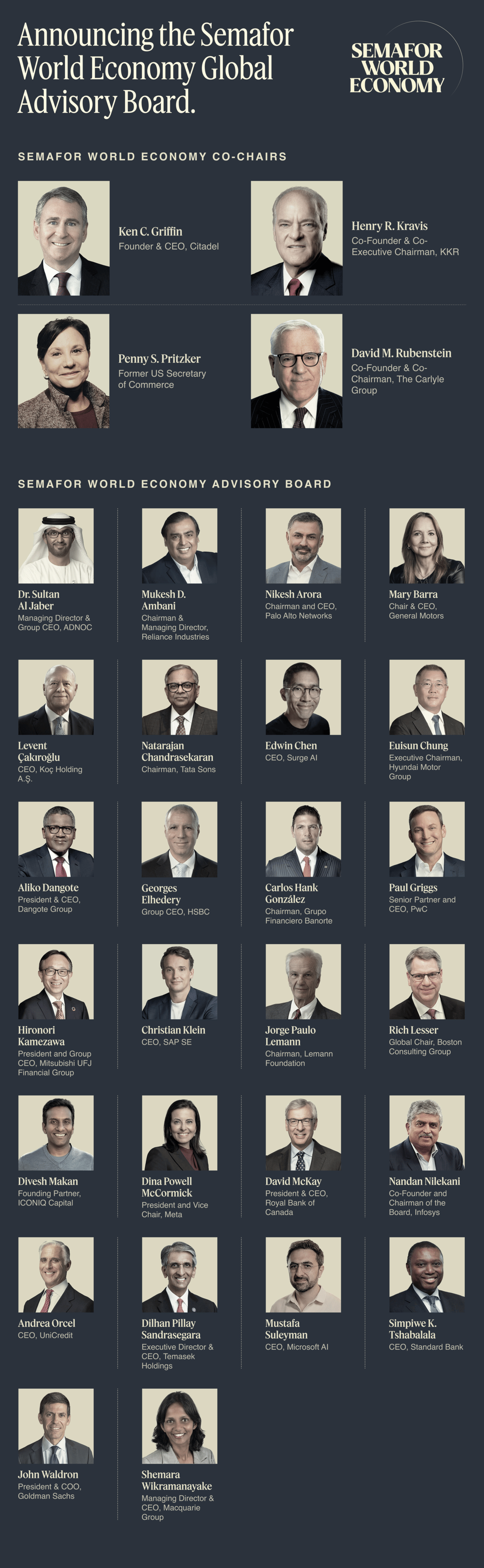 Semafor has expanded the Semafor World Economy Global Advisory Board, a group of visionary business leaders representing nearly every sector across the US and G20 — who will help guide the largest gathering of global CEOs in the United States of America.