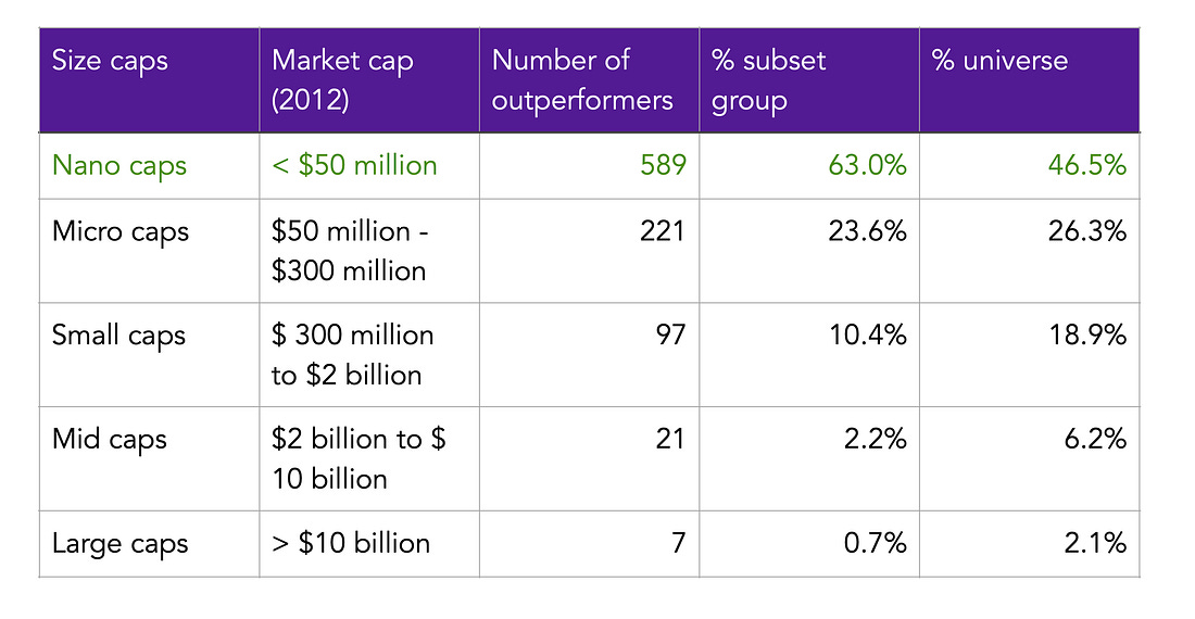 Two of the best microcap investors on the planet? Ian Cassel and Paul Andreola. They find stars like Lebron James when he was still playing high school basketball. Let’s learn the secrets from the world’s top microcap investors. Tiny TitansTiny Titans is all about finding small companies with 10x potential. It sold out in just 36 hours. The good news? You can now put yourself on the application list. If you do so, you will receive immediate access to a list of 93 (!) companies with 10x potential. Put yourself on the application list here: Why microcaps?My crazy friendYou know the name of one of my closest friends? His name is Mr. Market. What I love about him is that he is incredibly generous. He makes me trillions of offers daily. But what’s even better? Sometimes he is completely irrational. Some of his offers are just absurd. In November 2022, you could have bought Meta ($META) at a Price-to-Earnings ratio of 8.6x. Since then, the stock has gone up over 600%. But honestly, he doesn’t frequently make these kinds of offers in the large-cap space. Small caps on the other hand … The smaller the stock, the less efficient the market. Or in other words, the crazier my friend Mr. Market becomes. That’s exactly why there are big opportunities in this space. The data proves itA big study by Jenga Investment Partners found something interesting. 86.6% (!) of all stocks that went up 10x from 2012 to 2022 were microcaps. The Big FourMicrocap investors don’t like to waste time. They want to say no to a potential investment as quickly as possible. That’s why they will always check ‘The Big Four’ first: