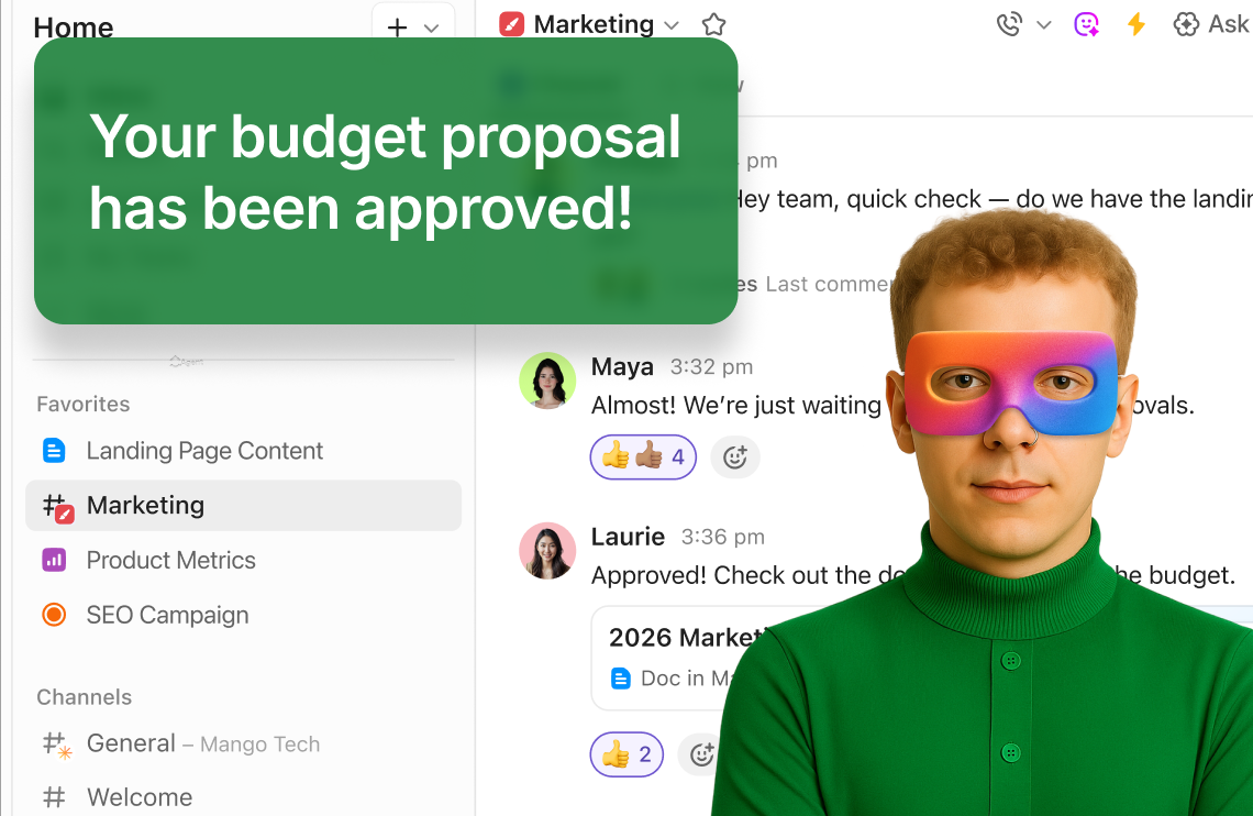 They initiate conversations, send reminders, and surfaces updates across DMs, chat threads, and task comments.