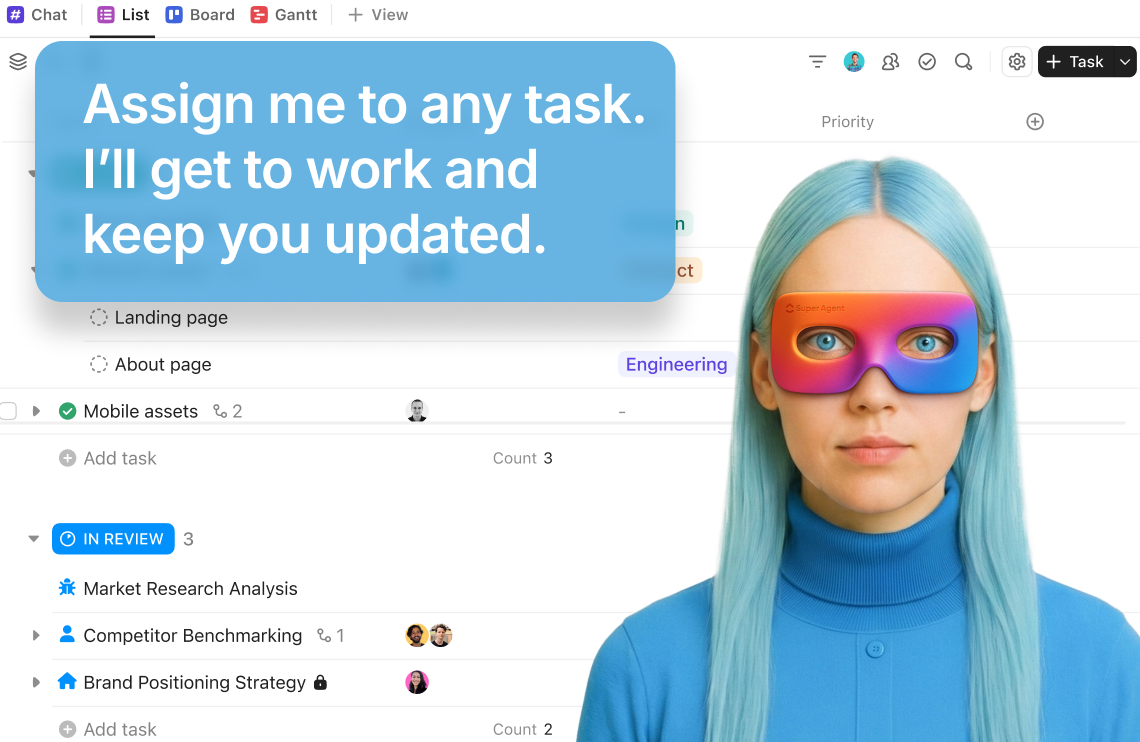 ClickUp Super Agents™ understand how your team operates. Give them any type of work, across any app, and they'll see it through.
