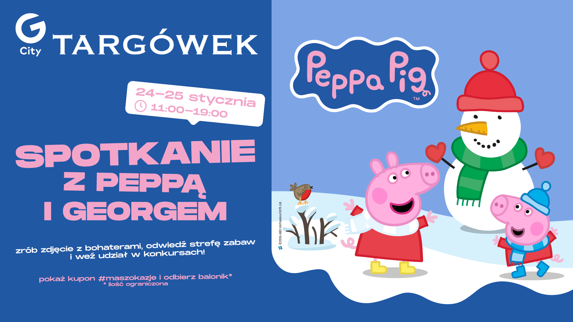 24 i 25 stycznia w G City Targówek czeka na Ciebie wyjątkowa zabawa z Peppą i jej bratem Georgem! W godz. 11:00-19:00 zapraszamy na mnóstwo atrakcji z kultową rodzinką Peppy! Co przygotowaliśmy dla najmłodszych?
