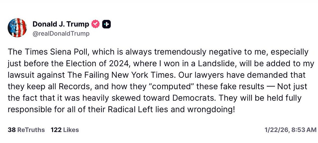 The 4th Axiom for Interpreting TrumpWhenever he tries to shoot the messenger, the message is worth your attention. For example …Friends, As Trump’s dementia worsens, several axioms are useful for interpreting his increasingly incoherent bloviation. Axiom #1: Whatever he asserts to be a fact is either a wild exaggeration or a bald-faced lie. Always disregard. Axiom #2: Whatever he blames on anyone else is something he’s done. He projects like mad, so his accusations are always windows onto what he’s worrying that others will discover about himself. Axiom #3: Whatever he criticizes as being fake news is a fact he doesn’t want you to know. So pay special attention to it. Axiom #4: Whenever he attacks some source of information — a survey, poll, or report — it’s come up with some truth he fears. So look at it and share it. (If you’ve got any other axioms, please share them with us.) A propos of the forth axiom, comes today’s New York Times/Siena University poll, which prompted a bilious message from Trump, saying he’s adding it to his lawsuit against the New York Times. Hence, the poll is worth your looking at and sharing. What does it show? That all the hand-wringing over Trump’s so-called “realignment” in the 2024 election was rubbish. There was no realignment. It’s true that when Trump took office a year ago, his approval rating was above 50 percent and he had made significant breakthroughs among traditionally Democratic groups of voters — especially young, nonwhite and and low-turnouts. But now that’s all gone. Only 40 percent of registered voters now approve of his performance. The supposed “demographic shifts” of the last election have completely vanished. Young and nonwhite voters disapprove of him even more than they did then, although he has kept most of his support among older and white voters. Overall, among registered voters nationwide, Democrats lead by five percentage points. It’s the largest lead for the Democrats in a Times/Siena national poll since 2020. It would be enough for them to take back the House of Representatives. The poll was done between January 12 and 17, before Trump threatened Greenland and after an ICE agent killed Renee Good but before many of the other atrocities committed by ICE in Minnesota fully came to light. But the biggest problem for Trump appears to be the economy. He was elected for two reasons: He said he’d get prices down and he’d avoid foreign entanglements. He’s reneged “bigly” on both promises So glad you can be here today. Please consider becoming a paid subscriber of this community so we can do even more. |