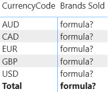 E = CALCULATE ( DISTINCTCOUNT ( Products[Brands] ) )