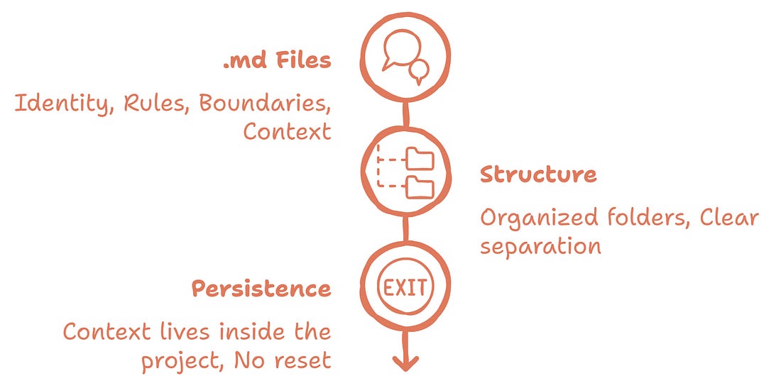 Before you build anything, learn these 3 foundational concepts.md Files (Markdown)An It is not complex code. An And that is the key difference. In a traditional chat, every conversation starts from scratch. In Claude Code, Project StructureClaude Code does not operate on a single file. It reads the entire project. That project may include different types of files, but the most important elements typically live inside How you organize those files into folders is not just a technical detail. It is a way of giving structure to the system. When you separate rules, context, and content, you are creating clarity. It is not about having many files. It is about ensuring that each file has a clearly defined purpose. Context PersistenceIn a traditional chat, each conversation begins almost from zero. In Claude Code, however, context remains within the project. This means the role, rules, and objectives do not need to be repeated in every interaction. In other words, the system already knows where it is and what it is building. And when that happens, the experience stops being improvisation and starts becoming architecture.