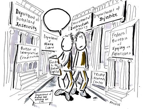 Friends, Please submit your caption in the Comments section and, as before, please use the Comments section only for captions. Winners will be announced next Sunday. For consideration, please post your caption by Monday at 9 pm PT, 12 midnight ET. Last week’s winner: “Where is the Department of Impeachment?” (Congratulations, KBright.) Runners-up: “Toto, I don’t think we’re in America anymore.” (Congratulations, Ellen Mattesi.) “Where’s the gift shop, I want to pick up a Presidential pardon while I’m here.” (Congratulations, Richard Eller.) “Where’s the Statue of Bigotry on the map?” (Congratulations, Scott Lichtenstein.) “It looks as though ‘Project 1984’ worked...” (Congratulations, Stephen Lahanas.) “I used to know my way around here.” (Congratulations, Whereabouts Unknown.) “I think we took a wrong turn, Harry. This is The House of Horrors!” (Congratulations, Donna Maurillo.) “Pedos, racists, and bullies, oh my!” (Congratulations, Russwin Francisco.) So glad you can be here today. Please consider becoming a paid subscriber of this community so we can do even more. |
