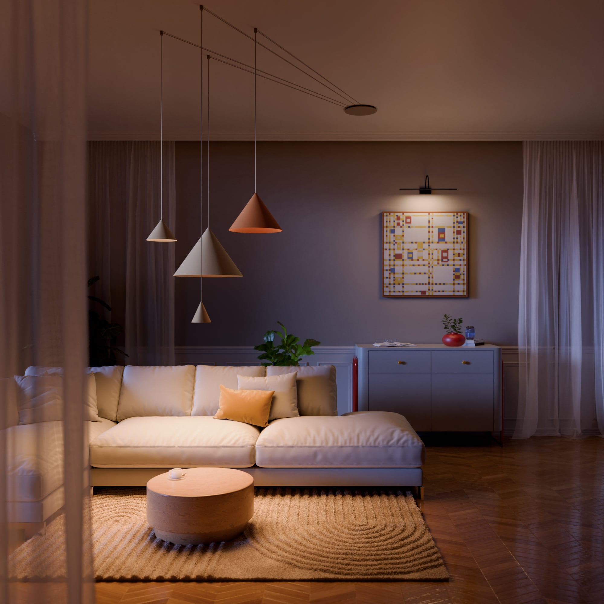 Pumpkin dołącza do Systemu Cameleon! To rozwiązanie będzie szczególnie doceniane w wysokich wnętrzach. Dzięki przewodom o długości od 1,5 do 7 metrów można dopasować ich światło do poziomu stref użytkowych, np. nad stołem w jadalni. Pumpkin dostępna jest w kolorach terakoty, beżu i jedwabistego grafitu, a także w dwóch formach i trzech rozmiarach: S, M i L.