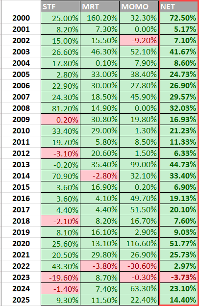So, which offers a better risk-adjusted return? One way to define it is: annual return / maximum drawdown So, you have… A = 0.33 B = 0.5 In this case, trading system B offers a better risk-adjusted return. That’s because you can use 3x leverage and get a 30% return with a maximum drawdown of 60% (compared to A with a 20% return). Now you might be wondering: “How do two trading strategies improve your risk-adjusted returns? Look at the table below… What you’re seeing are the results of three trading systems. On its own, they all have losing years. But when you combine them (meaning 1/3 of your capital to each trading system), you reduce the chance of having a losing year. That’s because when one trading system underperforms, you still have another that could be profitable. This reduces your losses and the chance of having a losing year (unlike my hairline, which loses every single year with no backup plan). And finally… Manage your expectations $10,000 is not life-changing money. It’s not enough to retire. It’s not enough to trade full-time. It’s not enough to give you financial freedom. But it’s enough to get started, to compound your returns, and grow your account to 7-figures over time. The keyword here is.. time. Here’s a real-world case study to explain… As you know, Warren Buffett is the world’s greatest investor. But do you know that 99% of his wealth came after he turned 65 years old? If he had stopped investing at 65, you probably wouldn’t even hear of him today. That’s how compounding works. Slow, insignificant, and then unstoppable. Kind of like how my love handles grew—barely noticeable at first, then BAM! Suddenly, I need new pants. Cheers, Rayner “still=waiting-for-his-hair-growth” Teo P.S. I'll be hosting a webinar where you'll learn how to grow your account to 7-figures and beyond (using rule-based trading strategies). Details here. |
