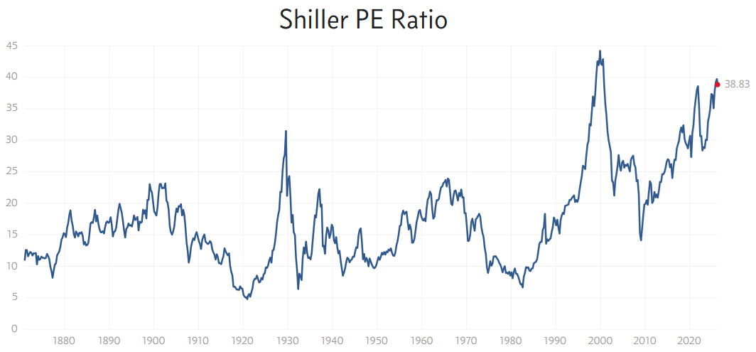The Shiller PE Ratio is at a level not seen since the ~2000 dot com bubble.