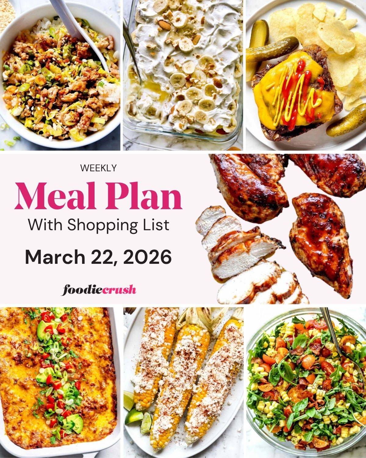 This week we are welcoming spring with potsticker rice bowls, grilled BBQ chicken, BBQ blue cheese chicken pizza, my dad's baked hamburgers, enchilada casserole, fresh mix and match sides, and classic banana pudding!