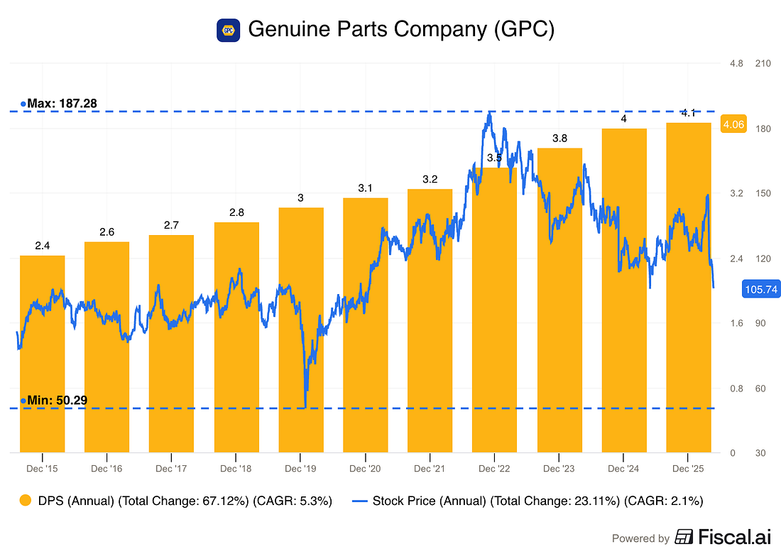 Most investors spend their lives focus on price. Watching tickers move up and down every day. But there’s a problem with that… in the short and medium term, price just reflects the market’s mood. As Ben Graham told us: The ‘long run’ can be much longer than you think. Watching price is volatile, it’s emotional, and it often has very little to do with what a business is actually worth. It sets you up to make emotional decisions - buying high and selling low. This is a lot of the reason that the average investor tends to underperform. If we want to build lasting wealth without the stress, we need to focus on more than price. Total ReturnTotal return looks at more than price. It’s generally defined as Capital Gains (Price Growth) + Dividends. The financial industry treats these two things as equal, but there are important differences. Price appreciation is theoretical, until you sell your shares. It’s paper profit that changes constantly while the markets are open. Dividends are the only tangible link between you and the business’s earnings. They are cash in your hand. They represent an actual business outcome. Profit delivered to your account. Just look at the difference between the dividends and price for Genuine Parts Company.