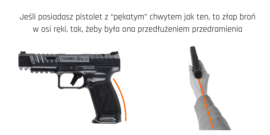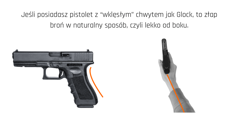 Chwyt Twojej broni, przy lekkim jej trzymaniu, powinien idealnie wypełniać całe wnętrze dłoni. Brak „luzów” i pustych przestrzeni sprawia, że masz poczucie jakby broń „kleiła Ci się do ręki”. Daje to poczucie pewności w trakcie wystrzału i nie prowadzi do kompulsywnego zaciskania dłoni, które mogłoby przesunąć wylot lufy i zaskutkować strzałem poza punktem celowania.