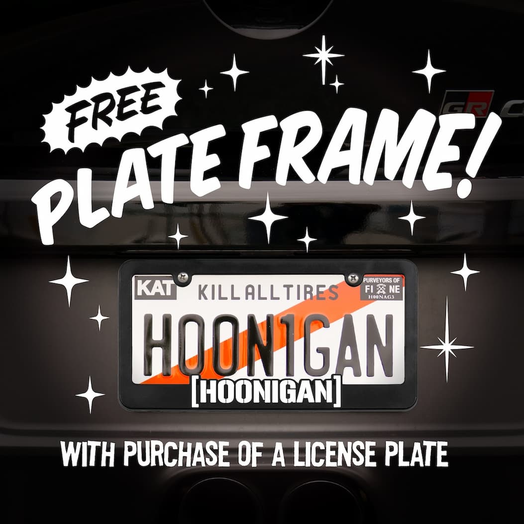 Pick a new Hoonigan plate, pick a frame, and the frame is AUTOMATICALLY FREE at checkout. Only while supplies last.