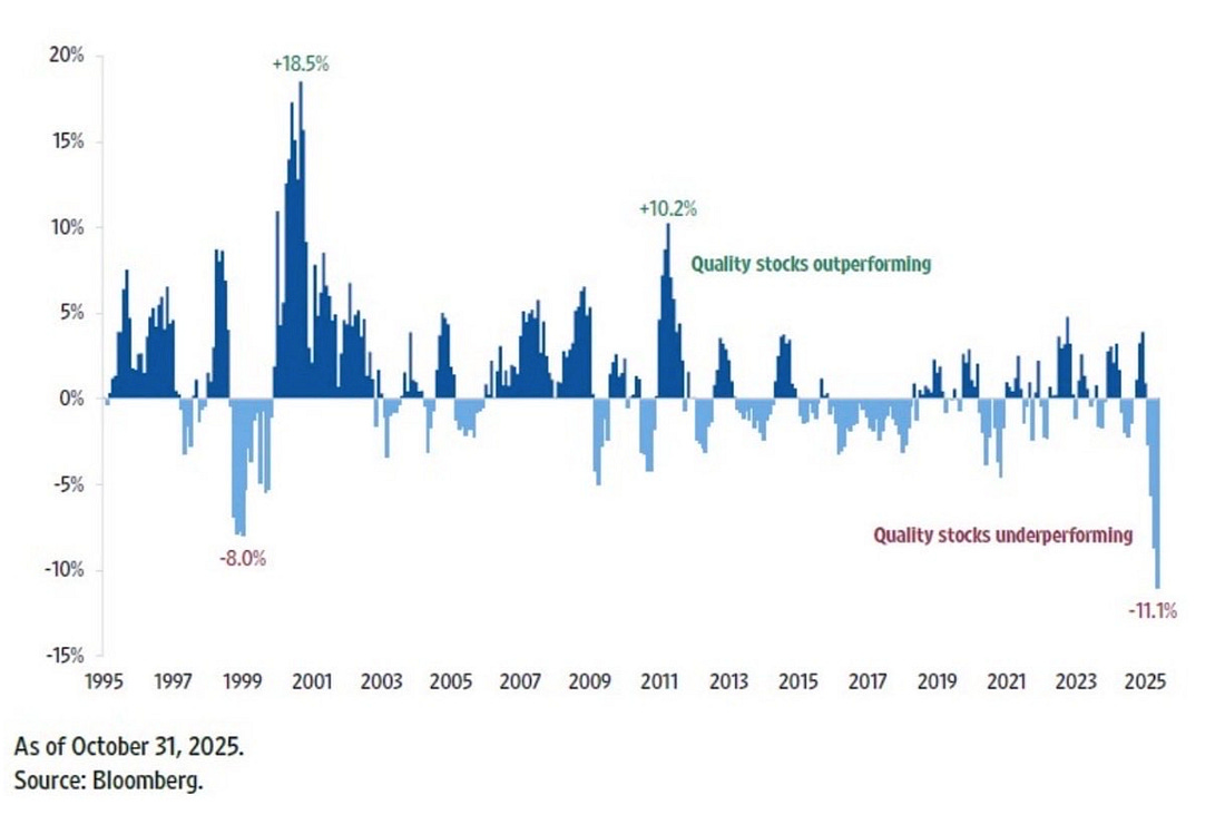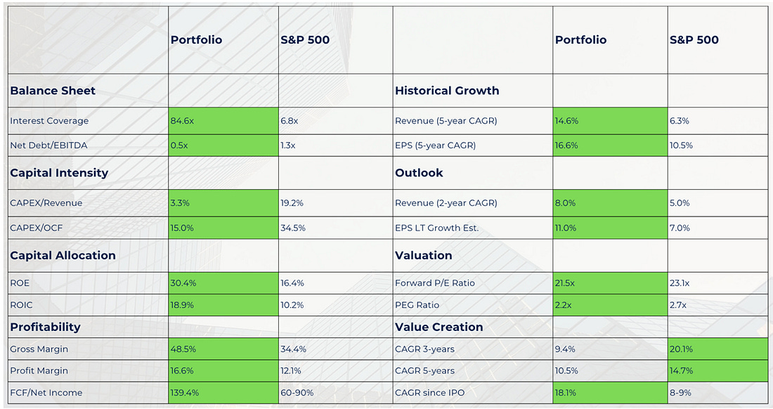 Hi Partner 👋 In 1999… just before the dotcom bubble burst… Quality stocks were as cheap as they had ever been. Investors were too busy chasing the internet hype to notice. The ones who did notice? They made life-changing returns. Just look at what they said about Warren Buffett just before the bubble bursted Here’s the thing. That exact same thing is happening right now. Quality stocks haven’t been this cheap compared to the market since 1999 (!). It’s like finding a Rolex at a garage sale. The price tag says $20, but the watch is worth $10,000. Our Portfolio is taking full advantage of this opportunity. I’ve never been more excited about what I see. Even my friend and billionaire Bill Ackman said it this week: Our Portfolio versus the S&P 500Let’s start with the basics. The S&P 500 is what most investors use as a benchmark. It’s a solid reference point. In the long term, you can expect a return of 7% per year from the S&P 500. But here’s where it gets interesting. Quality has proven to outperform the index over time: If we look at Our Portfolio, you see that we are invested in fundamentally way healthier companies compared to the market: The two most important takeaways?
