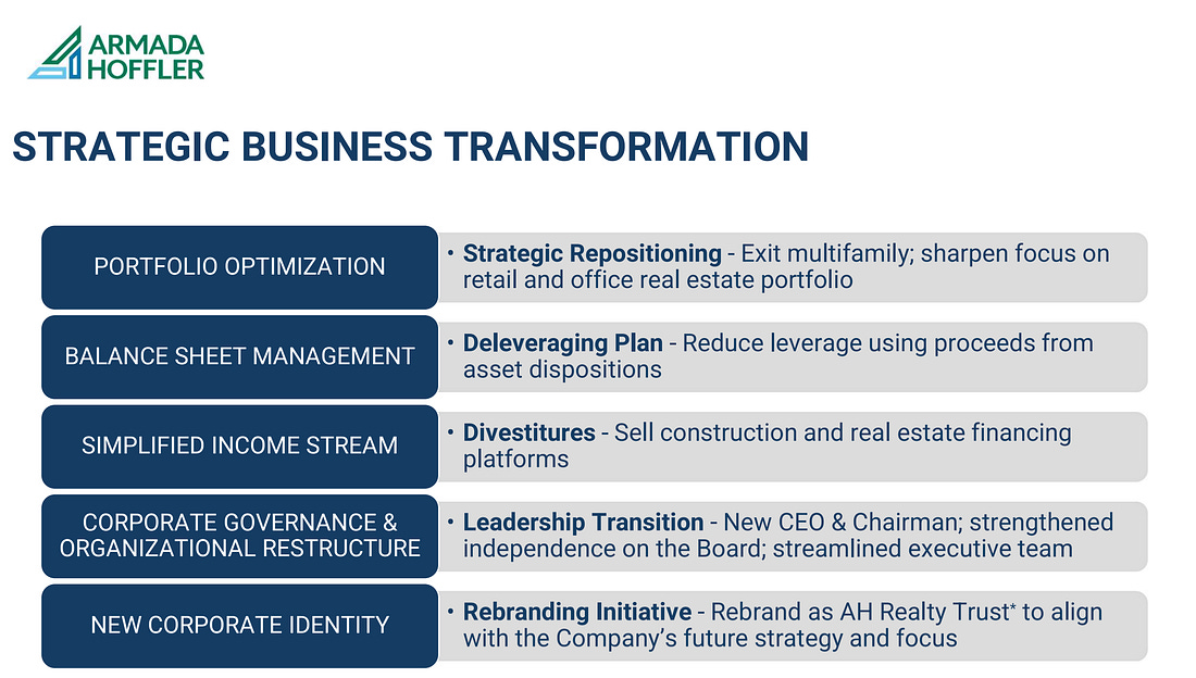 Shawn Tibbetts took over as CEO last year, and after a review of the company, decided to simplify it. Want to see the new look? Keep reading. Company OverviewArmada Hoffler officially became AH Realty Trust on March 2, 2026. The new name is align with the new strategy to: