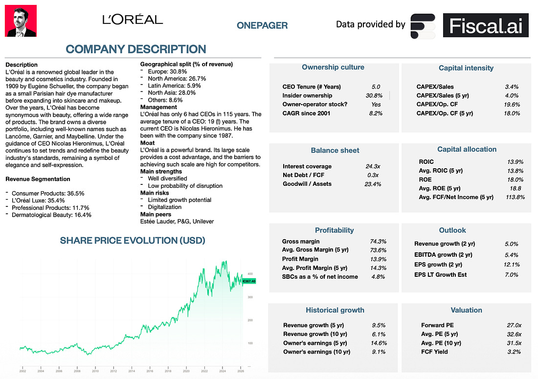 OnepagerHere’s a onepager with the essentials of L’Oréal 15-Step ApproachNow let’s use our 15-step approach to analyze the company. At the end of this article, we’ll give L’Oréal a score on each of these 15 metrics. This results in a Total Quality Score. 1. Do I understand the business model?The company behind your favorite beauty essentials? Go take a look in your bathroom and you’ll see it’s probably L’Oréal. They’re all about making us feel good. L’Oréal sells beauty and confidence with their iconic products. And they do it through 37 brands in 150 countries. Here’s a sneak peek at some of their products: