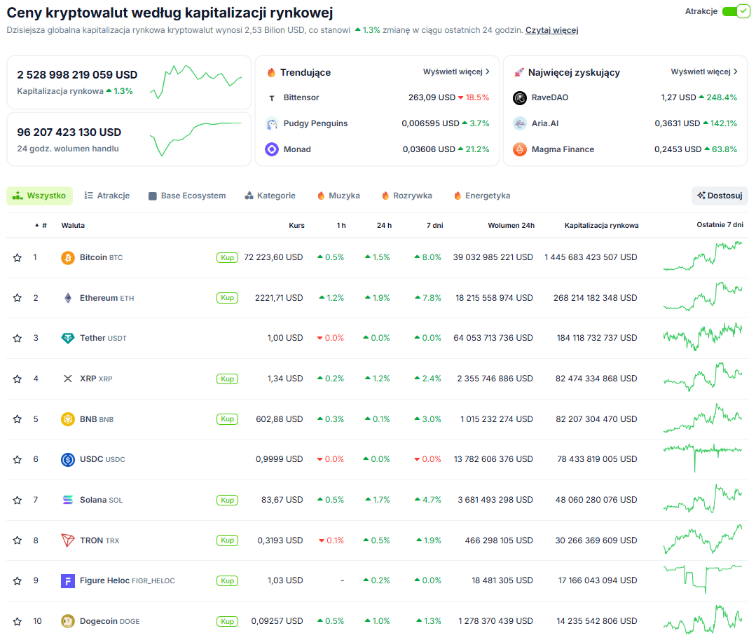 Bitcoin notowany jest w okolicach 72 200 USD, zyskując około 1,5% w ciągu 24 godzin oraz blisko 8% w skali tygodnia. Utrzymuje to pozytywny krótkoterminowy trend i potwierdza relatywną siłę lidera rynku. Kapitalizacja BTC przekracza 1,44 bln USD, co nadal zapewnia mu dominującą pozycję. Ethereum oscyluje w rejonie 2220 USD, również notując wzrosty – około 1,9% dziennie i 7,8% tygodniowo, co wskazuje na kontynuację odbicia po wcześniejszej słabości.