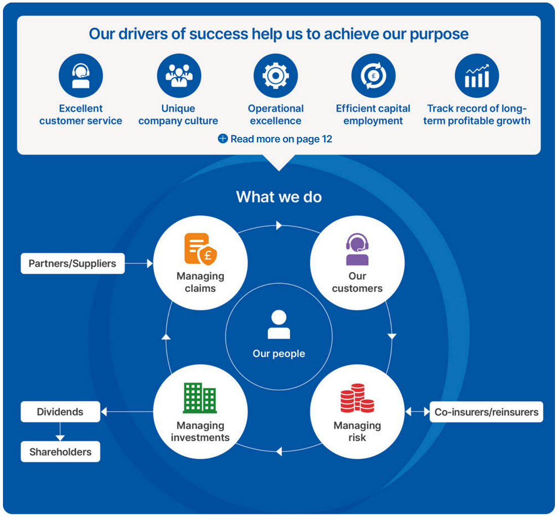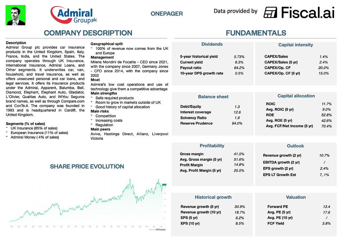 OnepagerDon’t know Admiral Group? Here are the basics (click on the picture to expand): Now let’s dive into the full investment case! 1. Do I understand the business model?Admiral makes most of their money from selling car insurance, but it’s really a data company. They use over 120 different AI and machine learning models to pick the safest drivers, and figure out exactly how much to charge each person based on their risk of having an accident. Unlike traditional insurers that keep all the risk on their own books, Admiral uses reinsurance. In 2025, they used reinsurance deals to pass 78% of their UK car insurance risk to other partners. This makes the business much safer and allows them to pay out most of their profits as dividends to shareholders. Revenue SplitMost of the revenue (which they call turnover) comes from UK car insurance. Here is the split for the 2025 fiscal year: