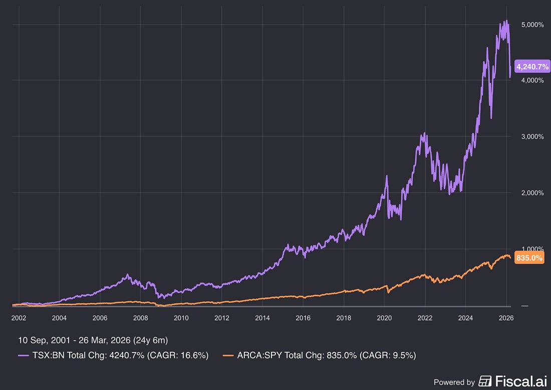 The most important thing for a holding company isn’t running the business. It’s making great capital allocation decisions (choosing which companies to invest in). Why are Holding Companies Interesting?Holding companies usually trade at a discount. This means you can buy them at a cheaper price than what they are actually worth. Brookfield Corporation is a great example. The holding is active in different segments: To understand Brookfield, you have to understand each one of these businesses. That takes a lot of time and effort. But it also creates opportunities. Investors often ignore these companies, causing them to trade at discounts. Brookfield Corporation currently trades at a price of $42. This means Brookfield Corporation trades at a 38% discount. This is a large discount from an historical perspective. On top of that, their track record is amazing. Brookfield has compounded at an impressive 16.6% per year since 2001. You can read more about Brookfield Corporation here.