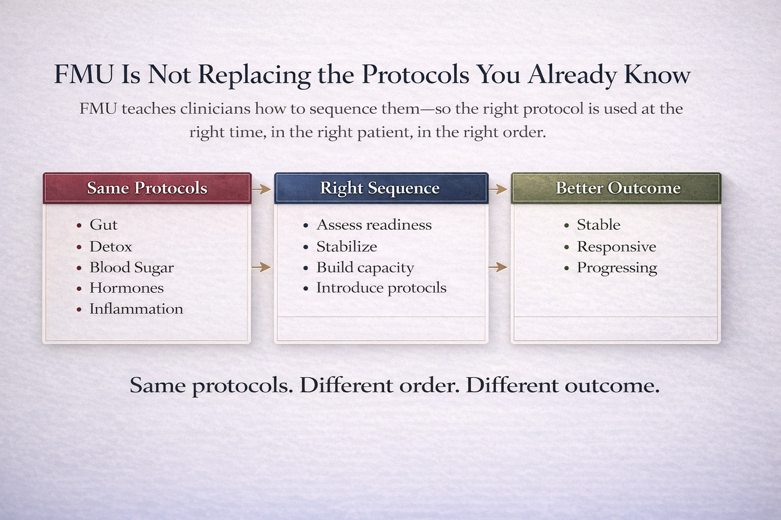 knowledge. They are struggling because they were never clearly taught how to determine what deserves attention first. If that sounds familiar, FMU was built for clinicians who want to practice with more clarity, order, and confidence.