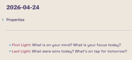 Before the last light leaves your device...at the end of the day, go back to your daily note to reflect and drop a couple reminders into the next day’s daily note. Nothing calms the mind like knowing it’s no longer responsible for holding onto lingering thoughts.