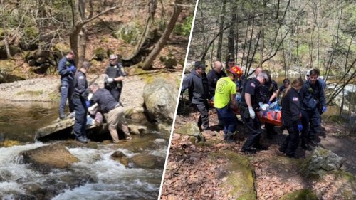 A man was rescued Thursday afternoon after breaking his leg and ankle, becoming trapped on a rock in Southwick, Massachusetts. Police in Southwick said a mother and children were walking on the trails at Granville Gorge when they heard the man screaming for help. They found him surrounded by rushing water, unable to get off the rock. Officers and firefighters responded to the gorge and waded out to the injured man, who explained that he slipped while jumping from rock to rock. |