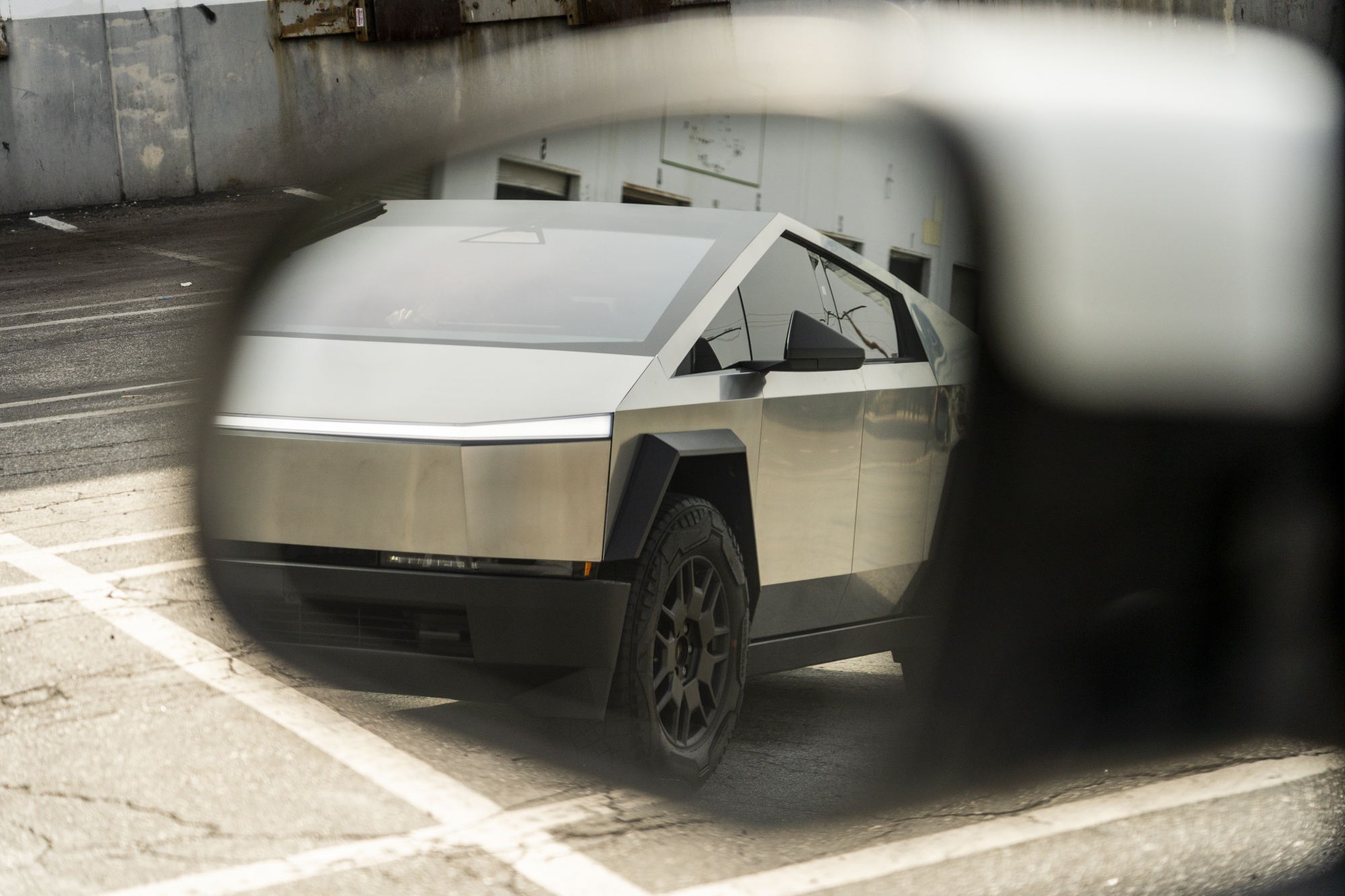 A Tesla Cybertruck is reflected in a side view mirror  Photographer: Kyle Grillot/Bloomberg