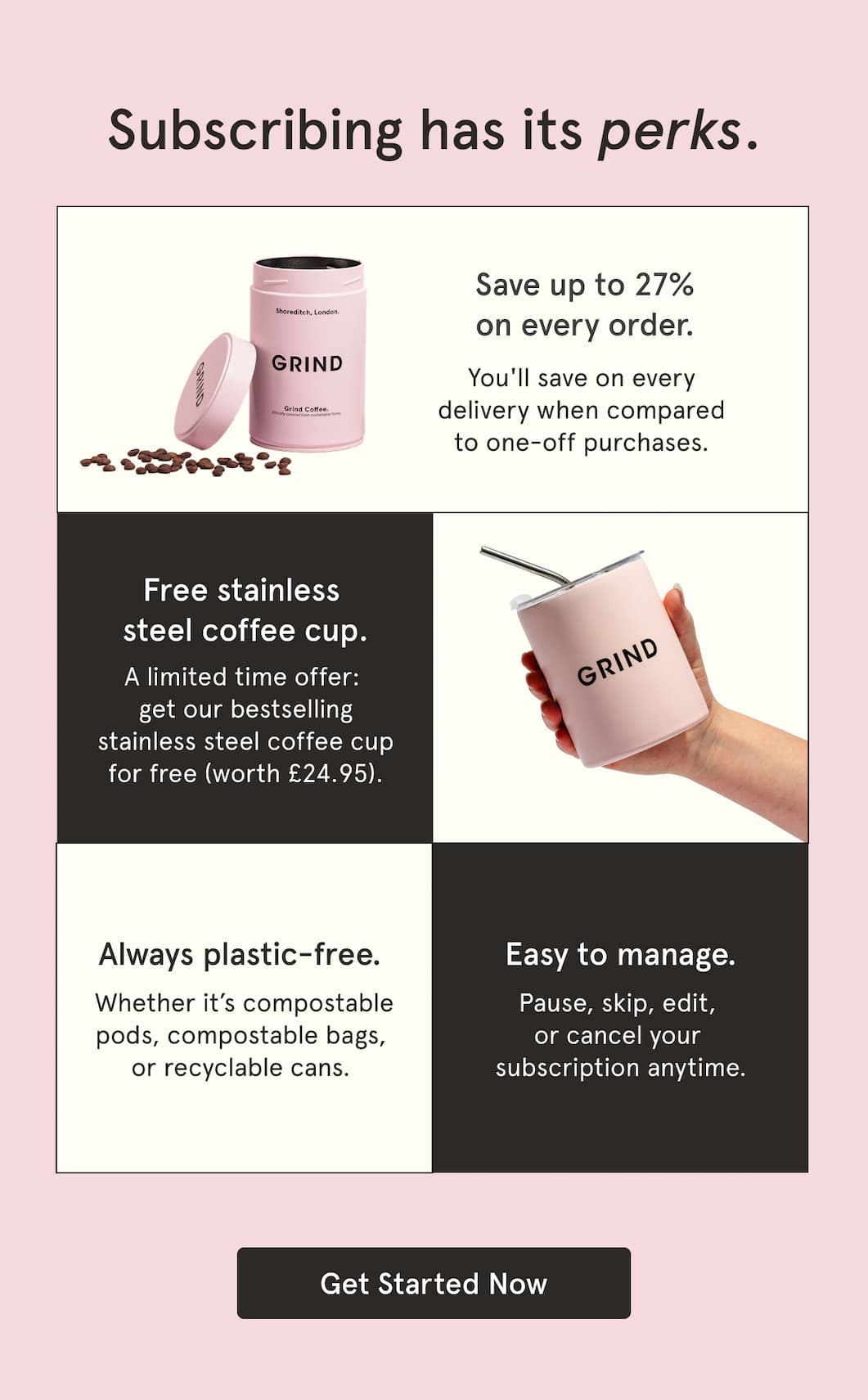 Our free cup offer applies to new subscription orders only, while stock lasts. A free Grind cup will be added to your basket when you purchase a subscription and use the discount code NEWCUP. This offer excludes existing subscription orders, gift subscriptions, gift cards, and one-time purchases, and cannot be combined with any other offer or discount. Offer applies to UK subscription orders only.