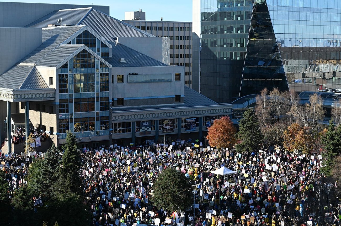 Demonstrators packed Anchorage’s Town Square Park on Saturday for a "No Kings" protest against the Trump administration's actions affecting a range of issues, including immigration, health care and public media funding.