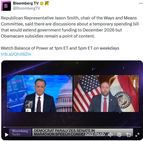 Today on Bloomberg Television’s Balance of Power early edition at 1 p.m., hosts Joe Mathieu and Tyler Kendall interviewed Republican Representative Jason Smith, chair of the Ways and Means Committee, and Democratic Representative Debbie Wasserman Schultz about the continuing standoff over government spending.