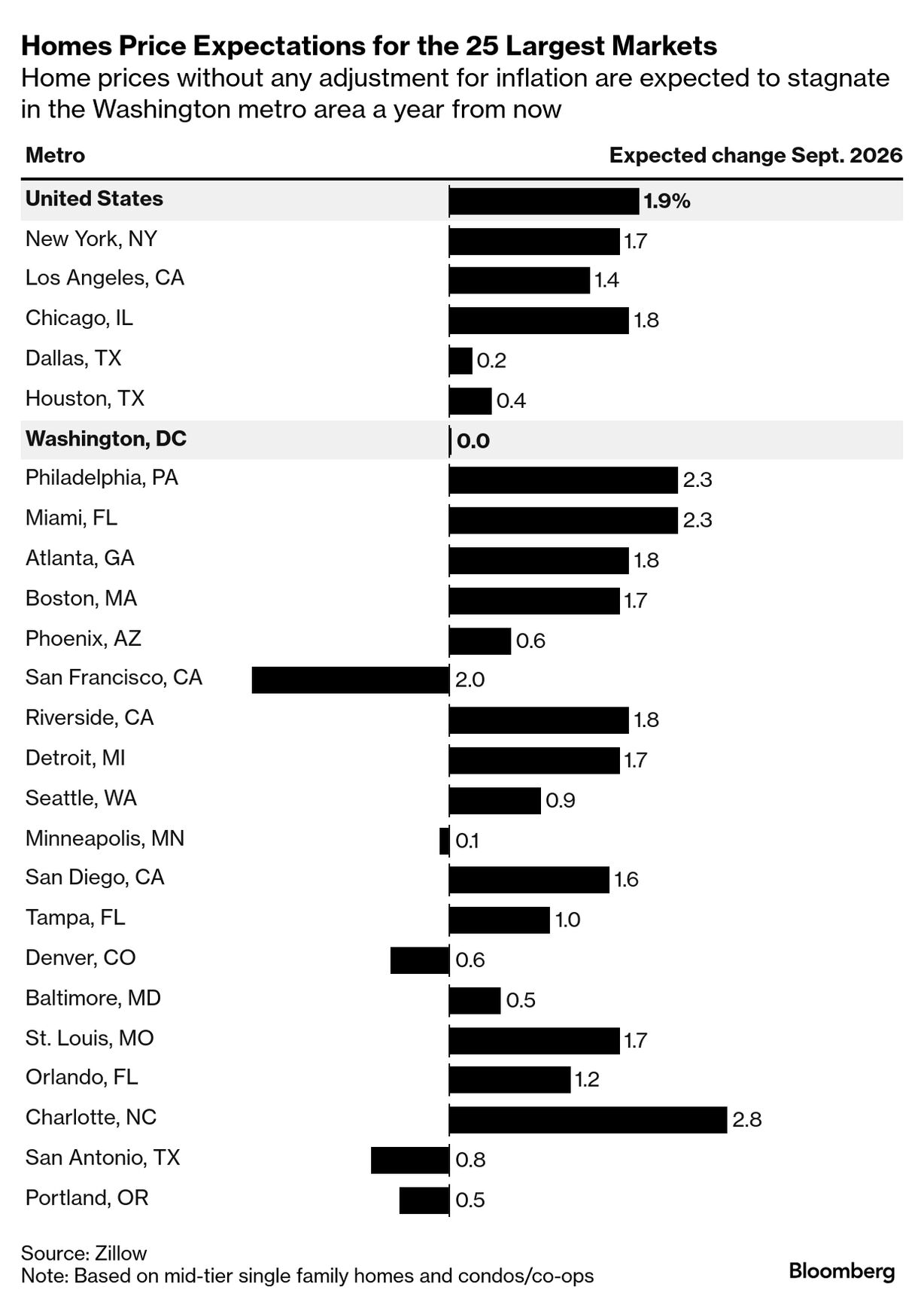 Home price gains in the Washington, DC, area are expected to come to an end, at least temporarily. Year-ahead forecasts from Zillow based on the typical home are expected to be unchanged or fall in 6 of the top 25 largest housing markets in the US. Nationally, homes are expected to gain 1.9% over the next year before adjusting for inflation. In the Washington area, homes prices in September 2026 are expected to show no change in value from September 2025. In five markets, led by San Francisco, prices are expected to fall, while prices in Charlotte, North Carolina, are expected to gain the most with a 2.8% increase. — Alex Tanzi