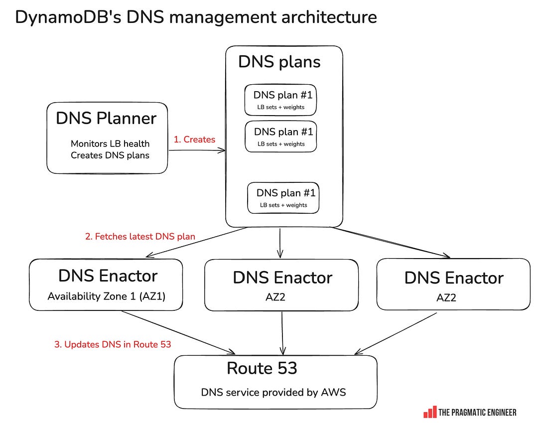 DNS enactor: the service responsible for updating the routes in Amazon’s DNS service called Route 53. For resiliency, there is one DNS enactor running in each availability zone (AZ). In us-east-1, there are 3 AZs, and 3x DNS Enactor instances.