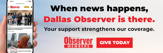 Dallas Observer relies on contributions — and campaigns like this one — to keep going strong. Thank you for your patience with a few extra emails this season. Make a contribution now, and you’ll receive fewer campaign messages through the end of the year. Thank you for being part of the Dallas Observer community—we couldn’t do this without you.