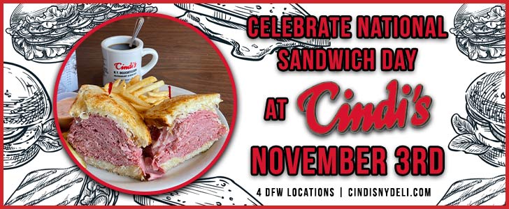 Hey Dallas, have you been craving the best sandwich in Dallas? Check out Cindi's NY Deli & Restaurant to celebrate National Sandwich Day on November 3rd!
