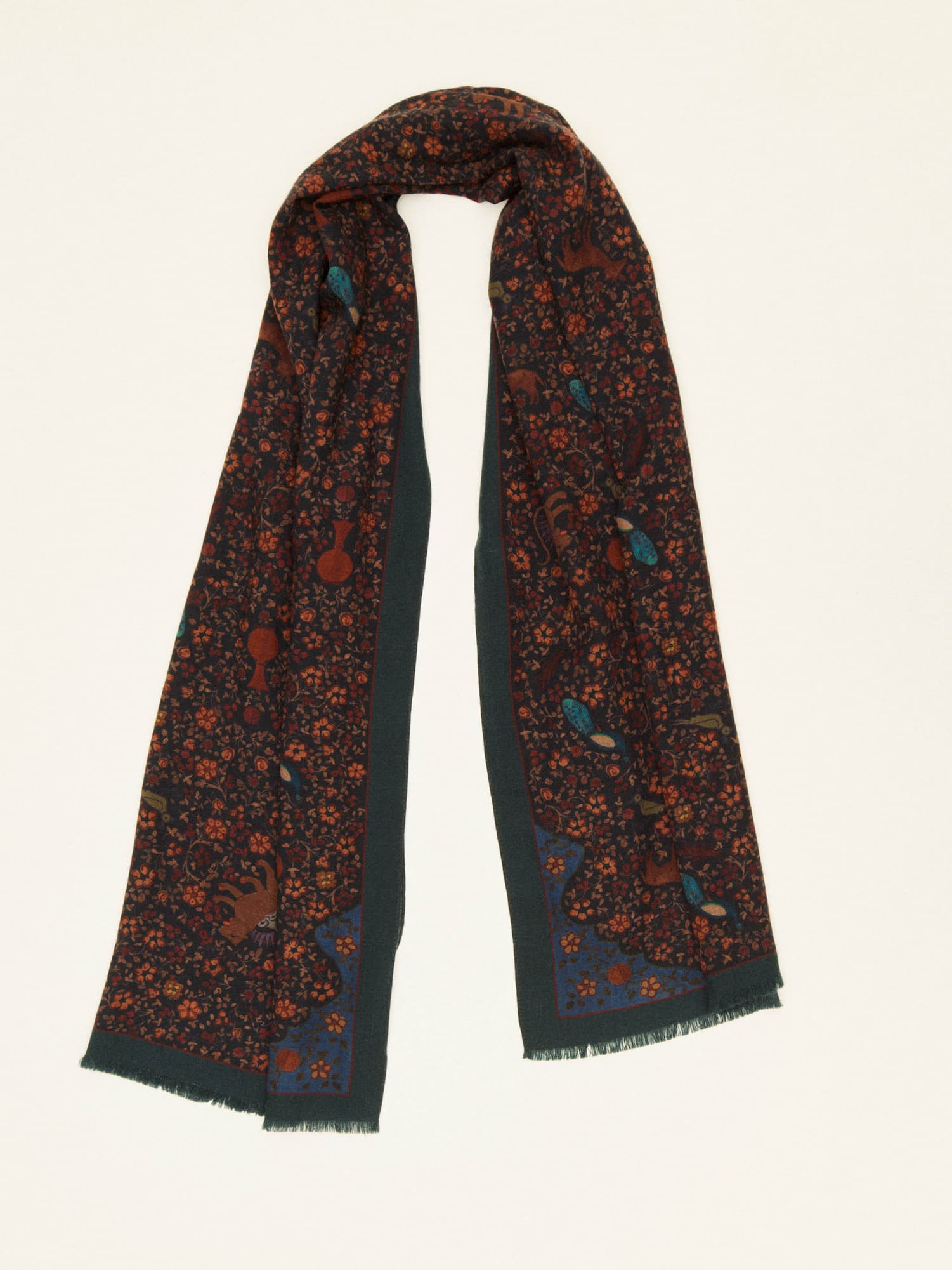 Made in collaboration between Parisian menswear brand De Bonne Facture and Monocle, this fringed scarf has an exclusive pattern, size and shape available only at Monocle. Featuring an ancient Persian lion symbol, sun and mystical animals set on a forest-green background, each piece also includes a handwritten signature from the De Bonne Facture founder Déborah Neuberg. Printed and sewn in Como by Italian scarf specialists.