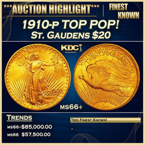 The 1909 is rare in MS66 and not a single coin is known in MS67. This coin displays satiny straw-gold luster that appears pristine under magnification. Razor-sharp detail in the headdress feathers and the eagle's wing complements the luminous glow from the recesses. Eye appeal is outstanding for a 1909.